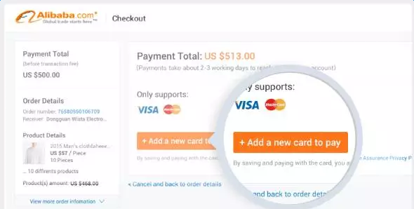 1000美金及以下訂單,僅支持信用卡支付方式。首次支付買(mǎi)家需添加付款賬戶(hù)、設(shè)置支付密碼,可通過(guò)郵箱或手機(jī)號(hào)碼設(shè)置支付密碼,后續(xù)付款直接輸入支付密碼即可。
